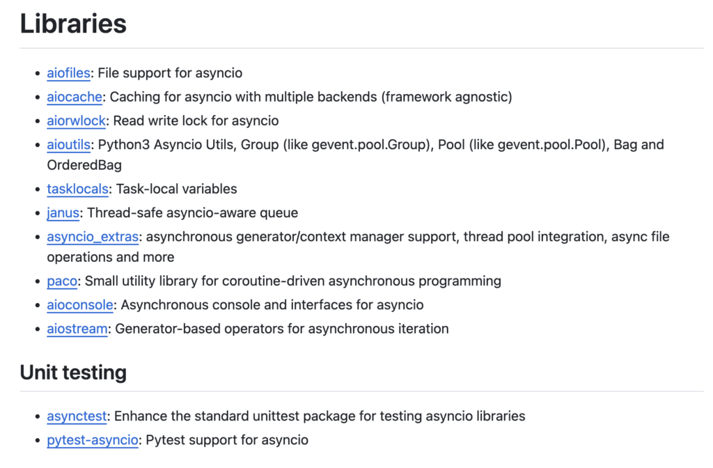 Thankfully, there are a number of Python library repositories and curated lists that we can consult when we require a third-party asyncio library that offers a specific feature.