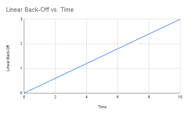 For example, if the random back-off interval was 0.3 seconds, then the linear back-off interval between retries would be calculated as follows for the first ten retries: