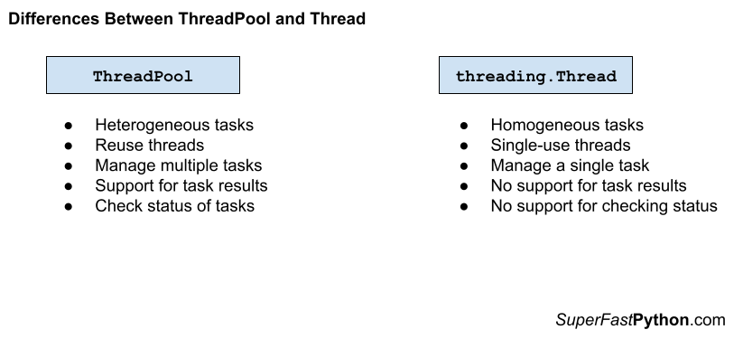 In this tutorial, you will discover the difference between the ThreadPool and Thread and when to use each in your Python projects.