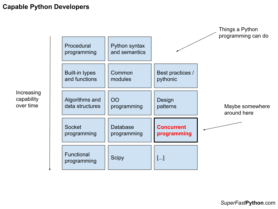 There are countless capabilities a Python program may require. The diagram below makes a clumsy attempt at listing just a few of them in increasing difficulty and shows where concurrency might fit. Does it help?