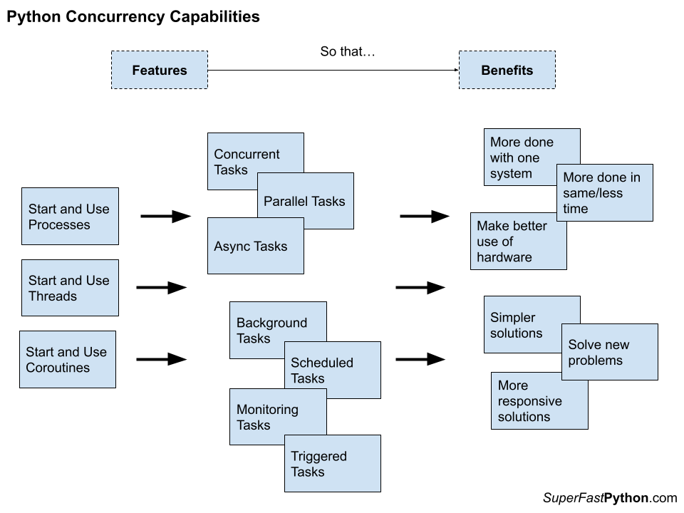 These are the lower-level benefits we can begin using directly when we bring concurrency into our Python programming projects.