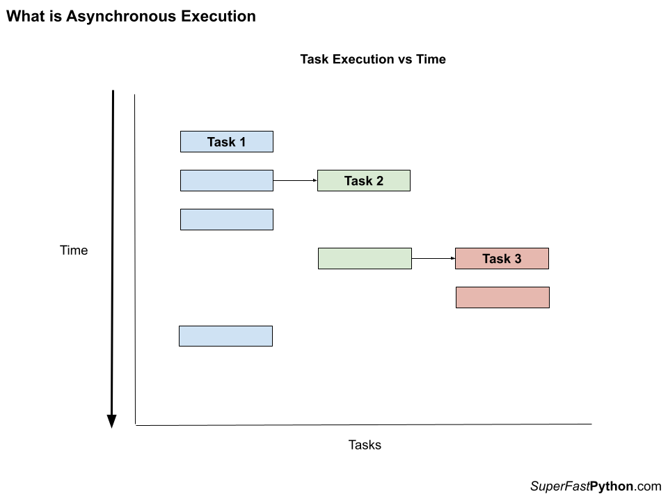 The diagram shows the asynchronous execution of three tasks. Time executing the tasks starts at the top of the chart and travels down, one step at a time.