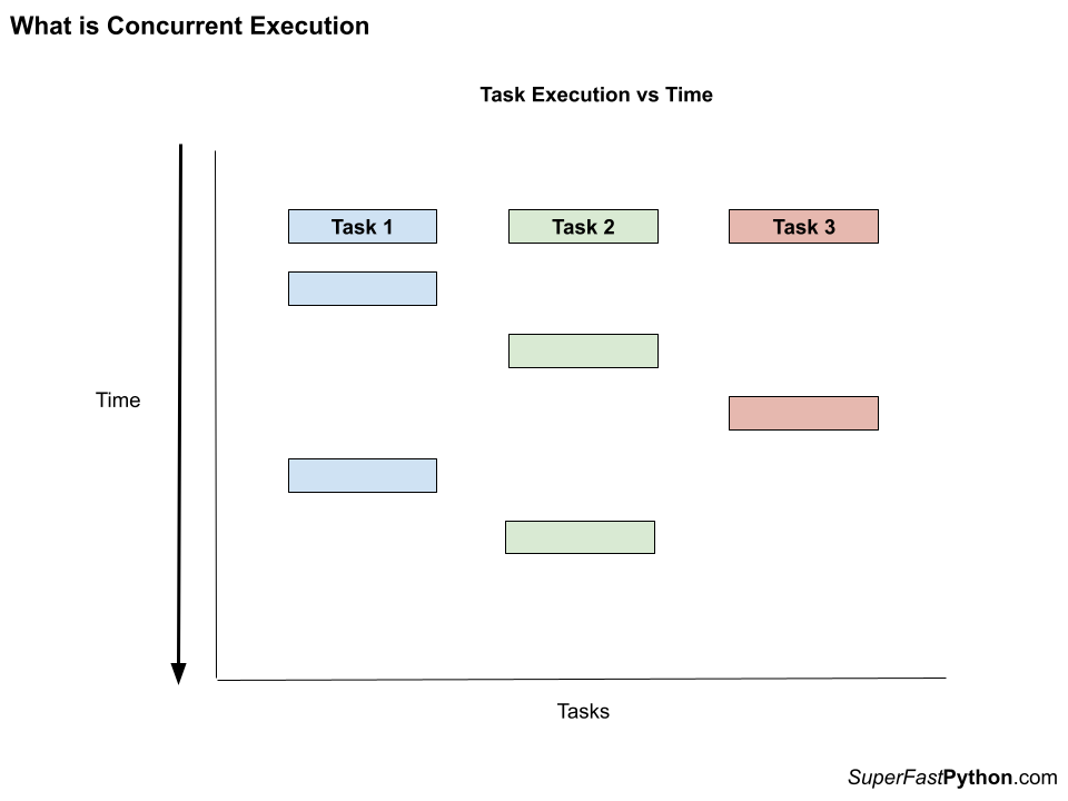 The diagram shows the concurrent execution of three tasks. Time executing the tasks starts at the top of the chart and travels down, one step at a time.