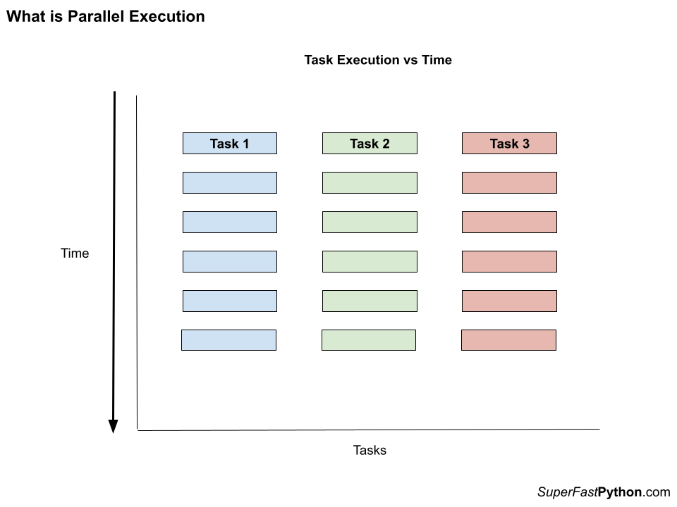 The diagram shows the parallel execution of three tasks. Time executing the tasks starts at the top of the chart and travels down, one step at a time.